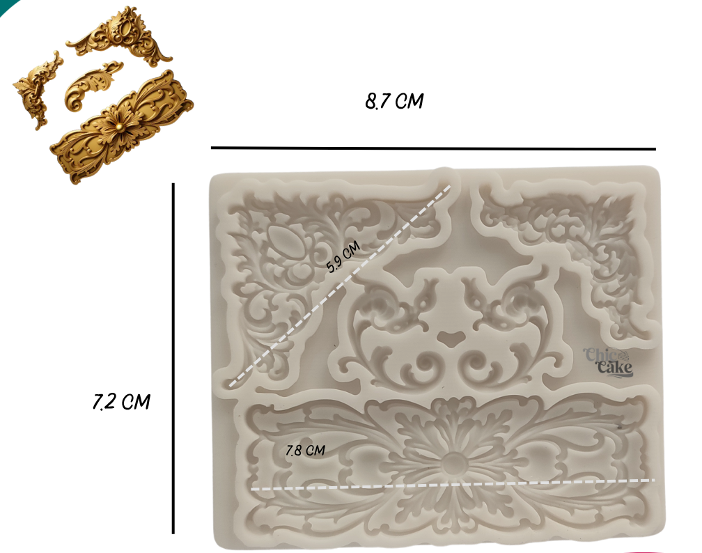 Este Molde Barroco Real está inspirado en los detalles ornamentales del arte clásico del siglo XVII. Perfecto para dar un toque lujoso a pasteles, galletas y postres decorados con fondant, chocolate o isomal